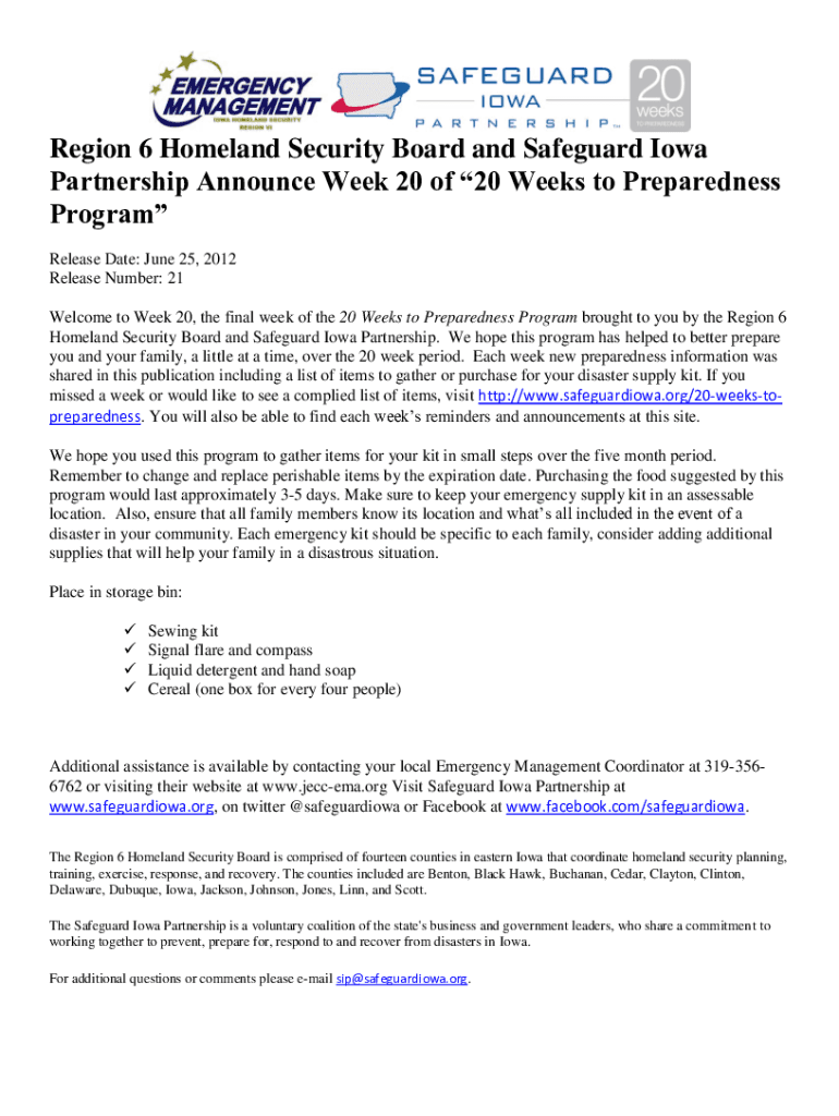 Region 6 Homeland Security Board and Safeguard Iowa Partnership Announce Week 20 of 20 Weeks to Preparedness Program Release Date: June 25, 2012, Release Number: 21 Welcome to Week 20, the final week