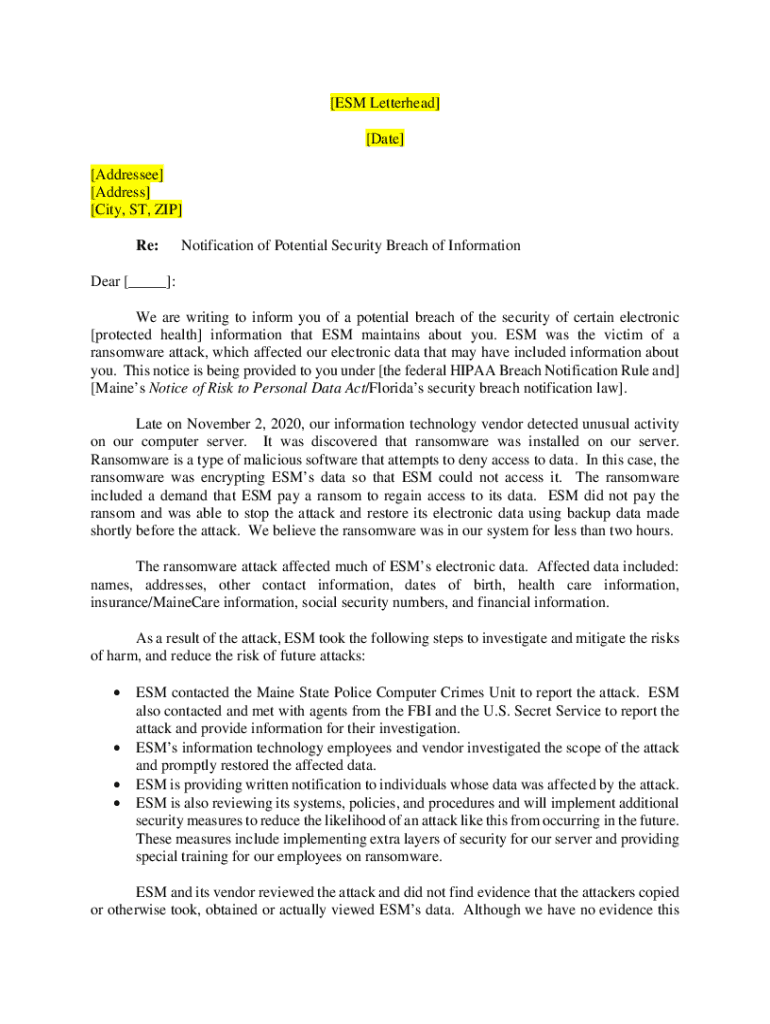 Get the free ESM, Template Breach Notification Letter (12-8-20).docx