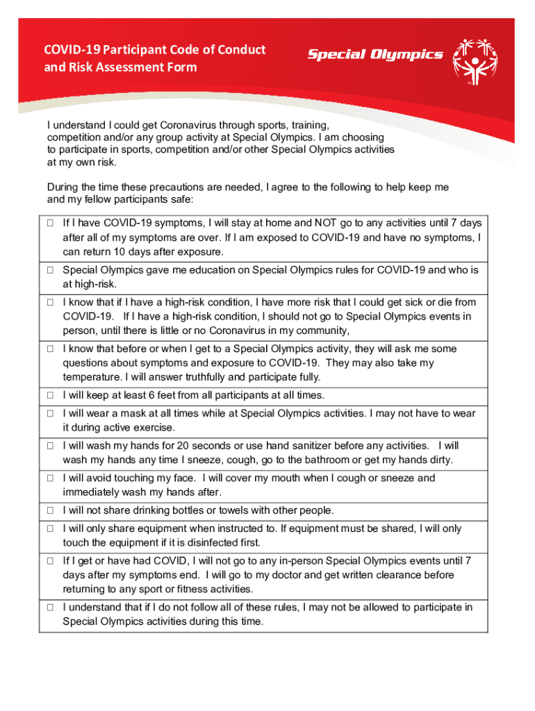 COVID-19 Participant Code of Conduct and Risk Assessment Form understand I could get Coronavirus through sports, training, competition and/or any group activity at Special Olympics. I am choosing