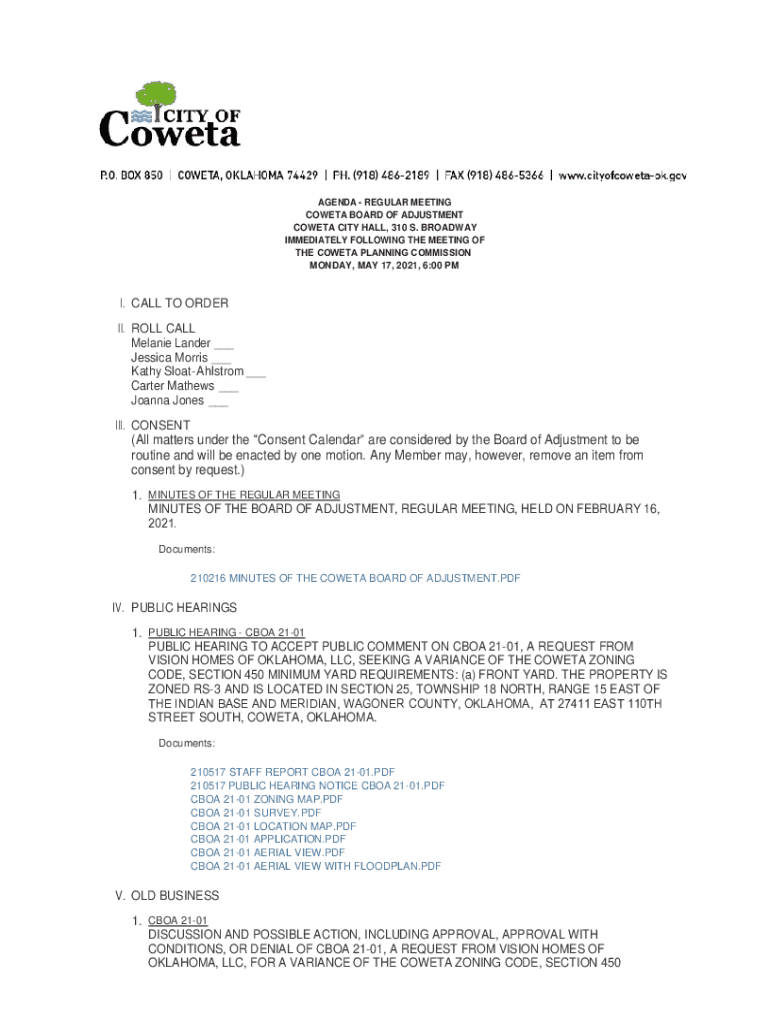 AGENDA REGULAR MEETING COMETA BOARD OF ADJUSTMENT COMETA CITY HALL, 310 S. BROADWAY IMMEDIATELY FOLLOWING THE MEETING OF THE COMETA PLANNING COMMISSION MONDAY, MAY 17, 2021, 6:00 PMI. CALL TO ORDER