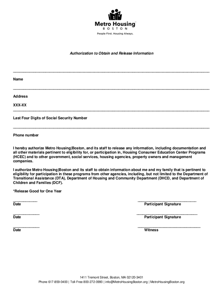 Authorization to Obtain and Release Information___ Name ___ Address XXXIX ___ Last Four Digits of Social Security Number ___ Phone number hereby authorize Metro Housing|Boston, and its staff to release