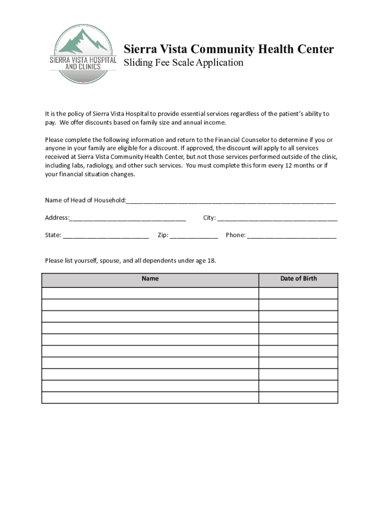 Sliding Fee Scale Application It is the policy of Sierra Vista Hospital to provide essential services regardless of the patients' ability to