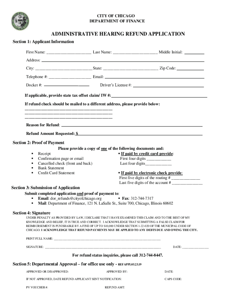 CITY OF CHICAGO DEPARTMENT OF FINANCEADMINISTRATIVE HEARING REFUND APPLICATION Section 1: Applicant Information First Name: ___ Last Name: ___ Middle Initial: Address: City: ___ State: ___ Zip Code: