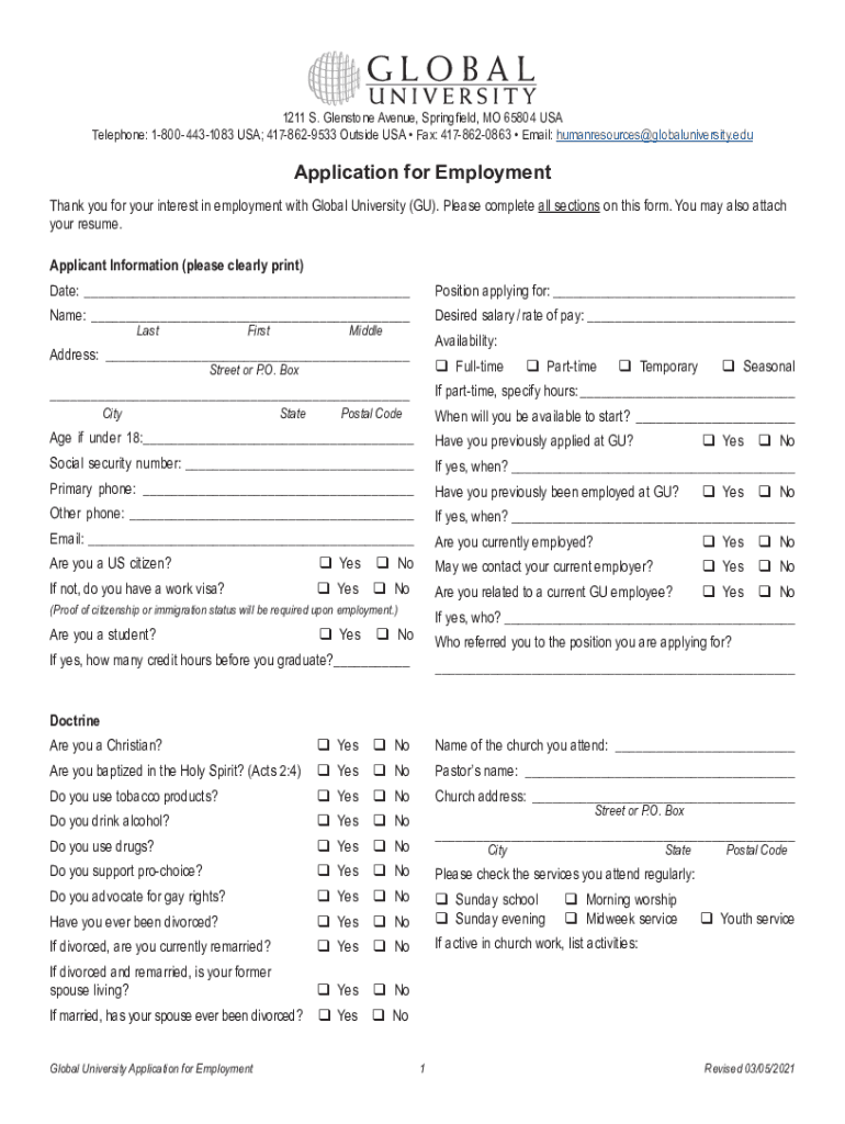1211 S. Glen stone Avenue, Springfield, MO 65804 USA Telephone: 18004431083 USA; 4178629533 Outside USA Fax: 4178620863 Email: humanresources@globaluniversity.eduApplication for Employment Thank you