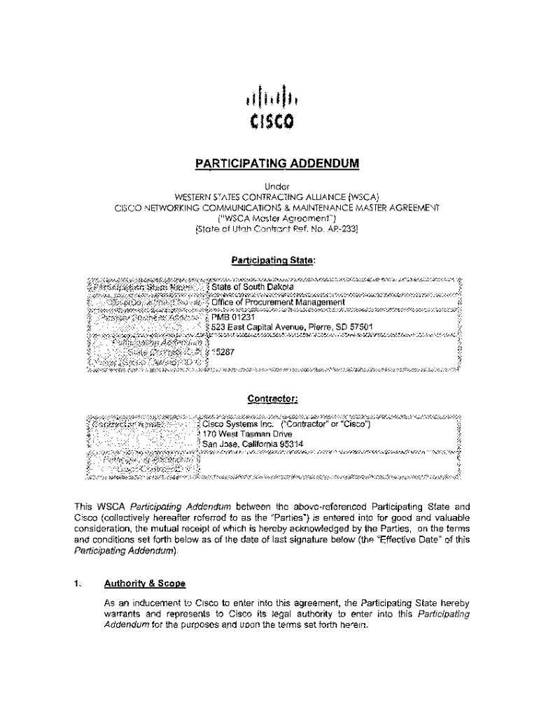 Cisco PARTICIPATING ADDENDUM Under WESTERN STATES CONTRACTING ALLIANCE (CSCA) CISCO NETWORKING COMMUNICATIONS & MAINTENANCE MASTER AGREEMENT (\” CSCA Master Agreement\”)[State of Utah Contract