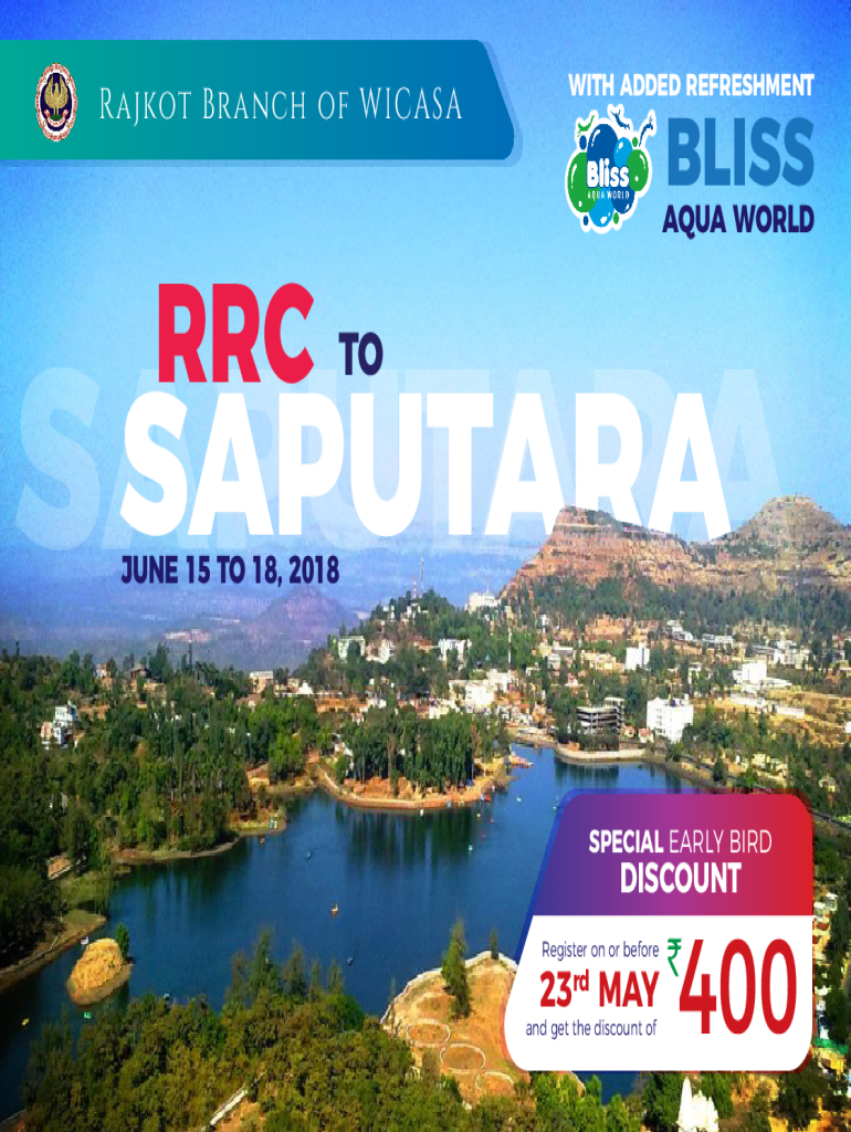 Rajkot Branch of WICASARRCWITH ADDED REFRESHMENTBLISS AQUA WORLDSAPUTARA JUNE 15 TO 18, 2018SPECIAL EARLY BIRDDISCOUNTRegister on or before23 MAY Rand get the discount of400`DAYS SCHEDULE Day 1: June