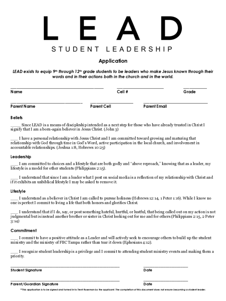 Application LEAD exists to equip 9th through 12th grade students to be leaders who make Jesus known through their words and in their actions both in the church and in the world. ___ Name ___ Parent