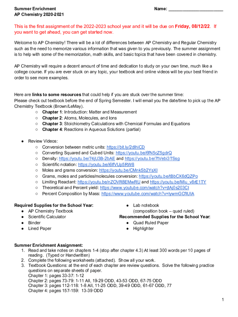 Summer Enrichment AP Chemistry 20202021Name: ___This is the first assignment of the 20222023 school year, and it will be due on Friday, 08/12/22. If you want to get ahead, you can get started now.
