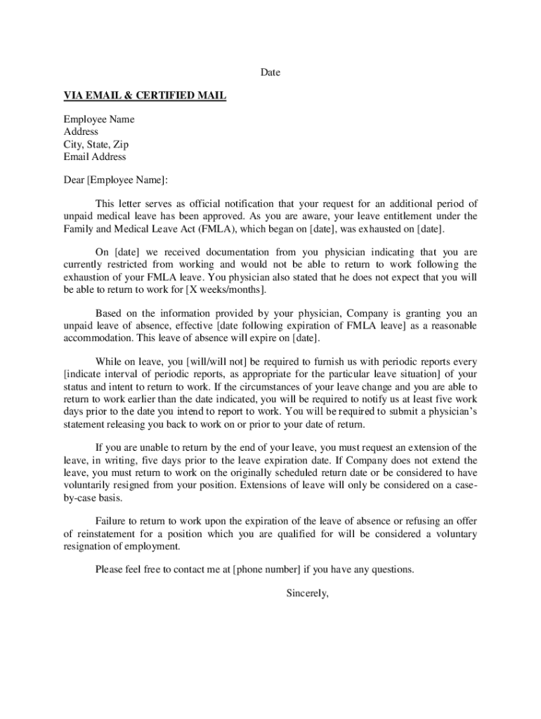 Date VIA EMAIL & CERTIFIED MAIL Employee Name Address City, State, Zip Email Address Dear [Employee Name]: This letter serves as official notification that your request for an additional period of