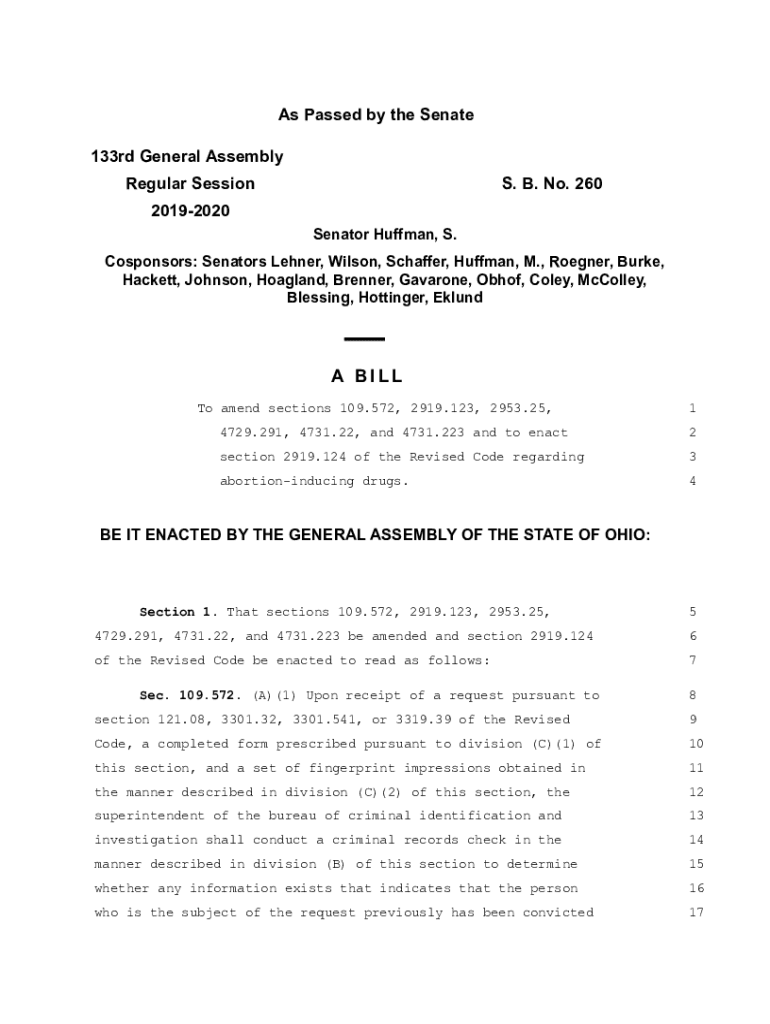 As Passed by the Senate 133rd General Assembly Regular Sessions. B. No. 26020192020 Senator Huffman, S. Cosponsors: Senators Lerner, Wilson, Shaffer, Huffman, M., Roger, Burke, Hackett, Johnson, Hoagland,