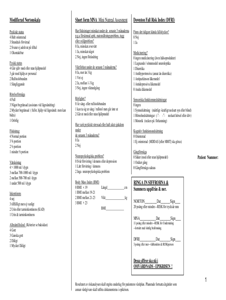 Modifier ad NortonskalaShort form MNA Mini Not real AssesmentDownton Fall Risk Index (DRI)Psykiskt status 4 Held oriented 3 Sundials frvirrad 2 Sarah ex defeat p Tillman 1 OkontaktbarHar frontage