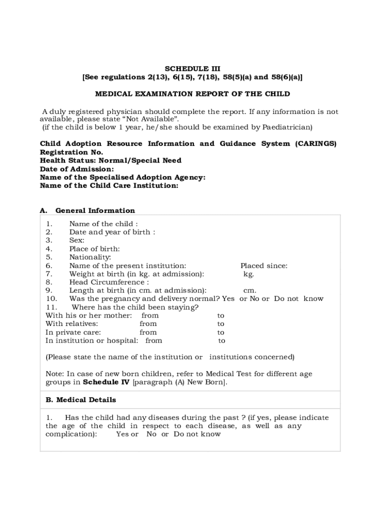 SCHEDULE III [See regulations 2(13), 6(15), 7(18), 58(5)(a) and 58(6)(a)] MEDICAL EXAMINATION REPORT OF THE CHILD A duly registered physician should complete the report. If any information is not