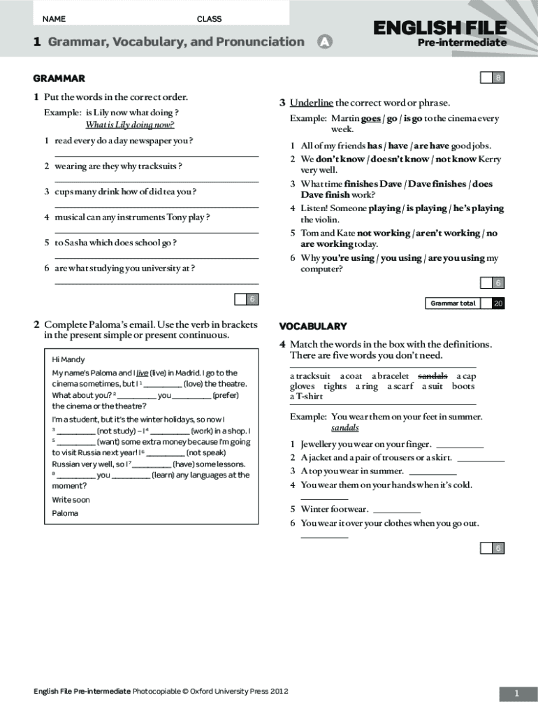 NAME CLASS1 Grammar, Vocabulary, and Pronunciation ENGLISH FILE PreintermediateGRAMMAR81Put the words in the correct order.3Underline the correct word or phrase. Example:is Lily now what doing ? What