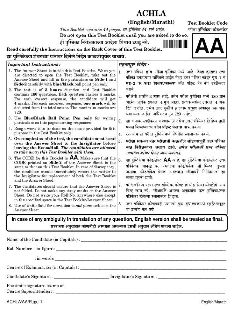 AC HLA (English/Marathi)Test Booklet Codes Booklet contains 44 pages. M nwpVHo$V 44 no Amos. Arm nwpVHo$Mm Homos/ghost Do not open this Test Booklet until you are asked to do so. Hr nwpVH$m Arnhem`m