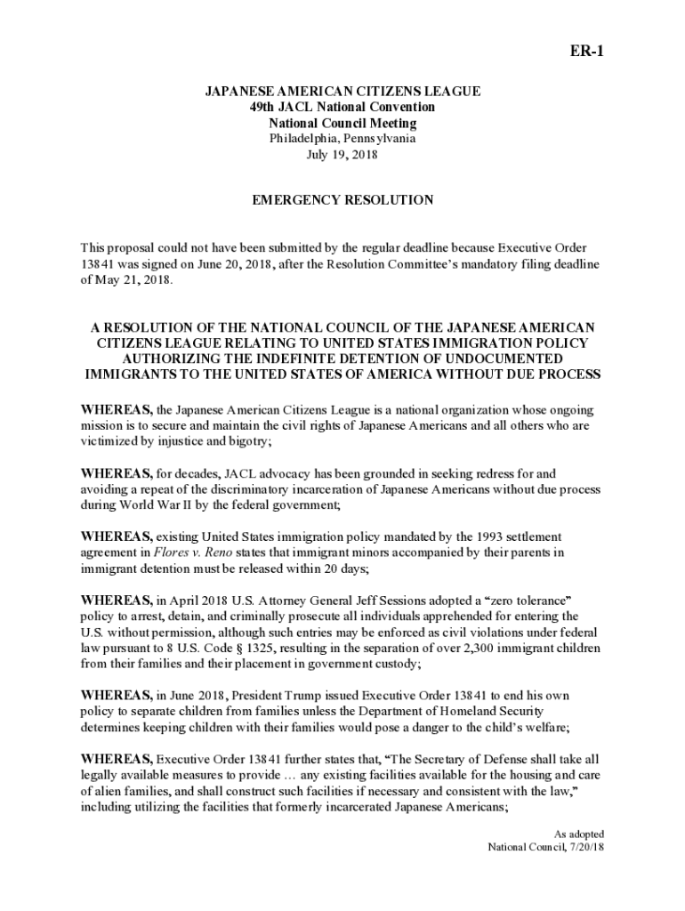 ER1 JAPANESE AMERICAN CITIZENS LEAGUE 49th JACK National Convention National Council Meeting Philadelphia, Pennsylvania July 19, 2018, EMERGENCY RESOLUTION This proposal could not have been submitted