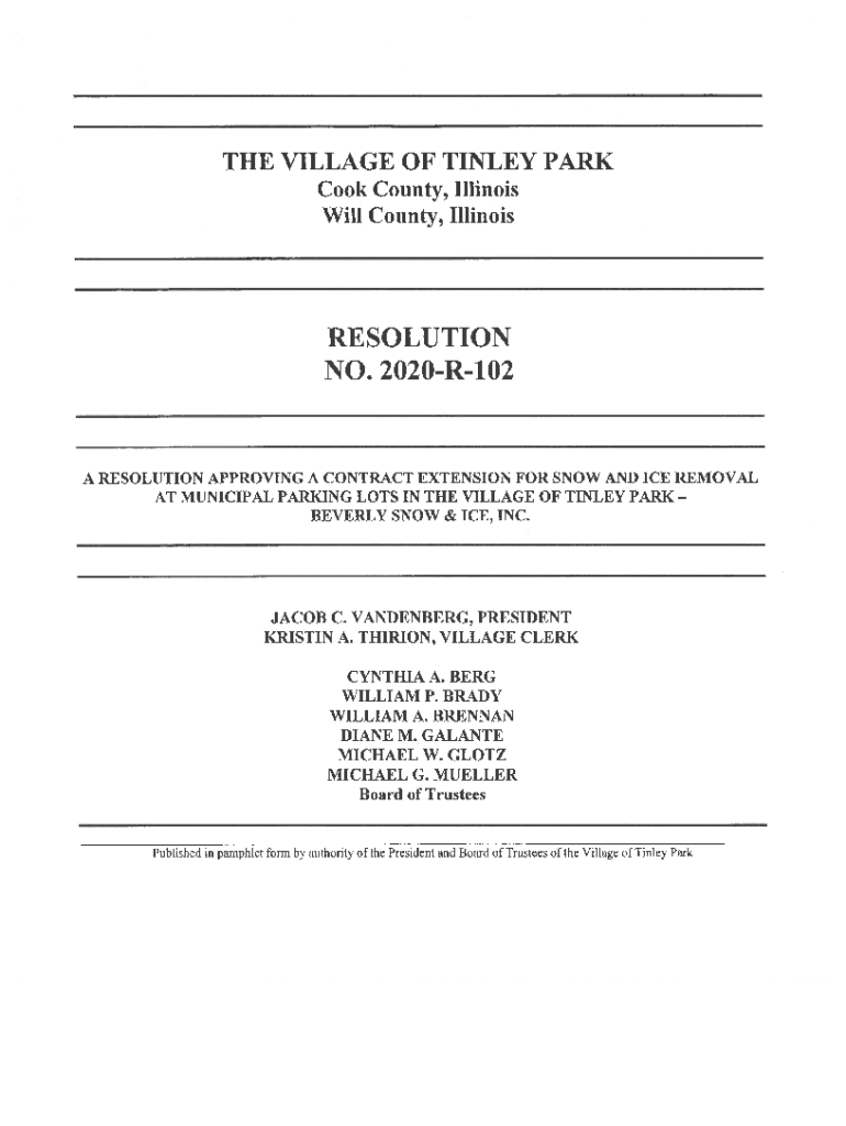 THE VILLAGE OF TINLEY PARK Cook County, Illinois Will County, Illinois RE SOLUTION NO. 2020R102A RESOLUTION APPROVING A CONTRACT EXTENSION FOR SNOW AND ICE REMOVAL AT MUNICIPAL PARKING LOTS IN THE