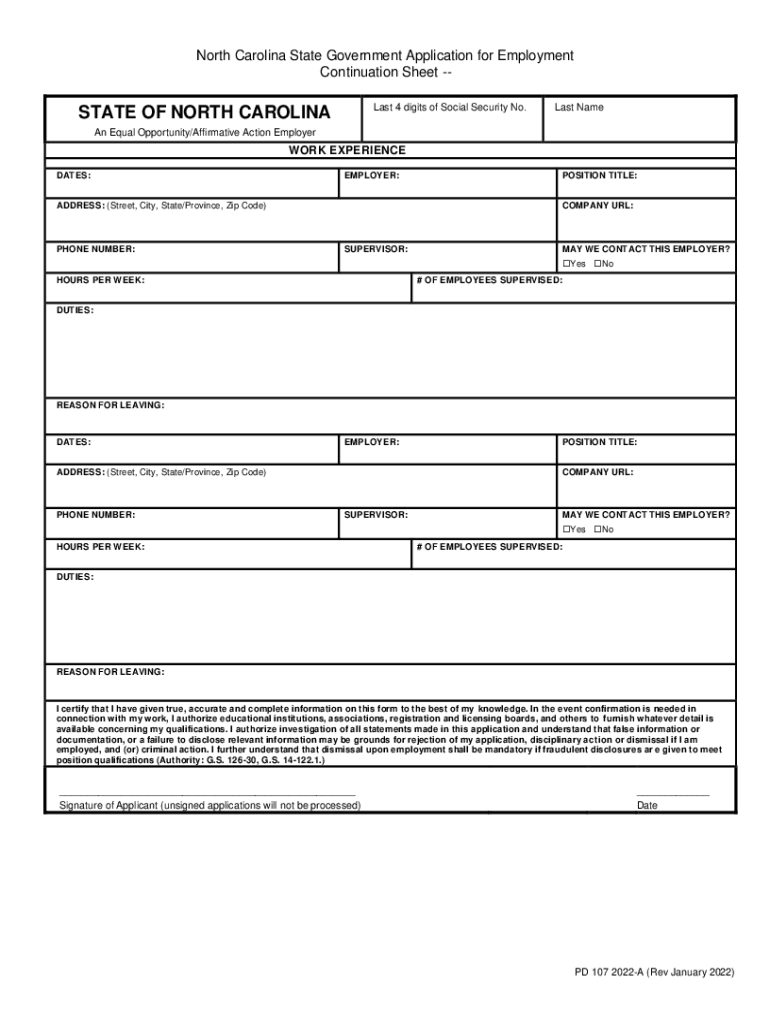 North Carolina State Government Application for Employment Continuation Sheet Last 4 digits of Social Security No. STATE OF NORTH CAROLINALast Name Equal Opportunity/Affirmative Action EmployerWORK