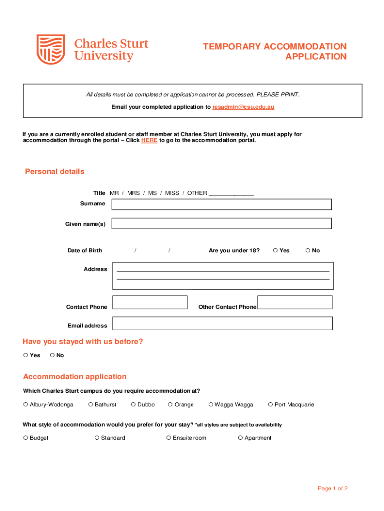 TEMPORARY ACCOMMODATION Application details must be completed or application cannot be processed. PLEASE PRINT. Email your completed application to resadmin@csu.edu.auIf you are a currently enrolled