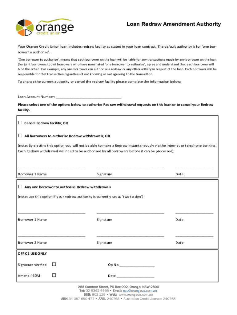 Loan Redraw Amendment Authority YourOrangeCreditUnionloanincludesredrawfacilityasstatedinyourloancontract. Thedefaultauthorityisforoneborrowertoauthorise. Oneborrowertoauthorise, meansthateachborrowerontheloanwillbeliableforanytransac