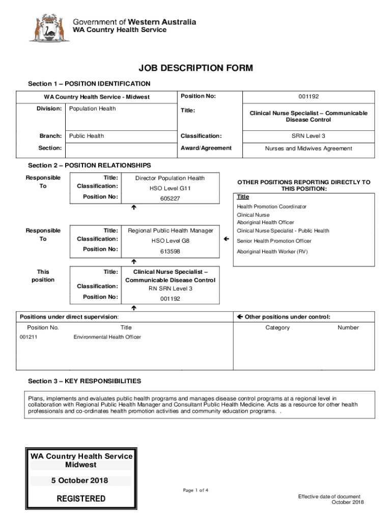 JOB DESCRIPTION FORM Section 1 POSITION IDENTIFICATION Position No:WA Country Health Service Midwest Division:Branch:Population Healthily:Public HealthClassification:Section:001192 Clinical Nurse