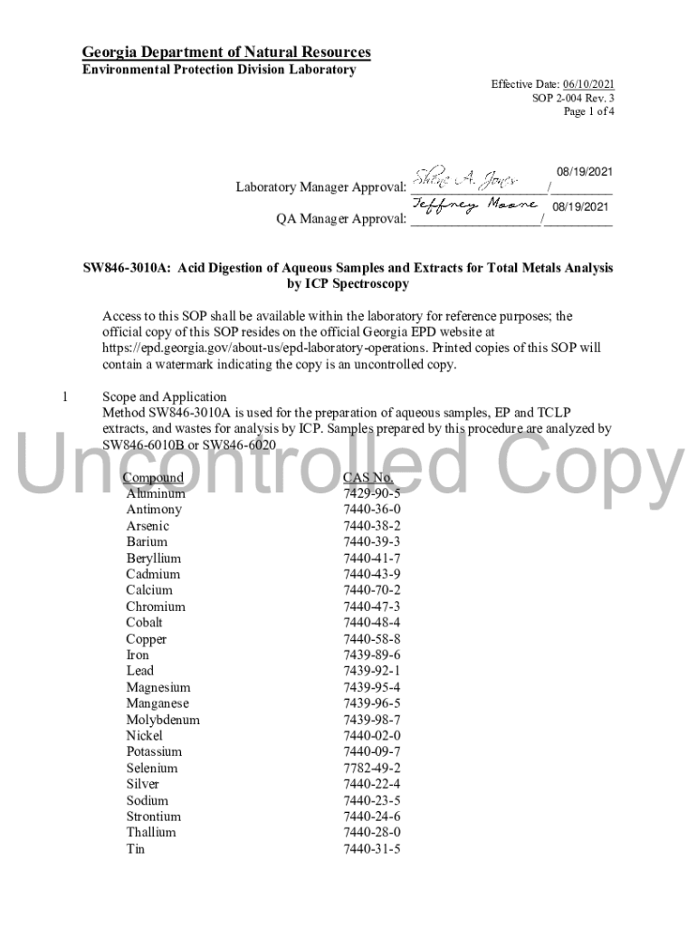 Georgia Department of Natural Resources Environmental Protection Division Laboratory Effective Date: 06/10/2021 SOP 2004 Rev. 3-Page 1 of 408/19/2021Laboratory Manager Approval: ___/___ 08/19/2021QA