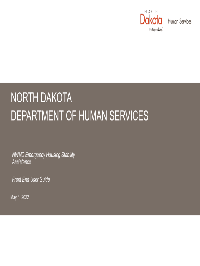 NORTH DAKOTA DEPARTMENT OF HUMAN SERVICES NW ND Emergency Housing Stability Assistance Front End User Guide May 4, 2022Disclaimer: This information is not a formal dissemination of information by