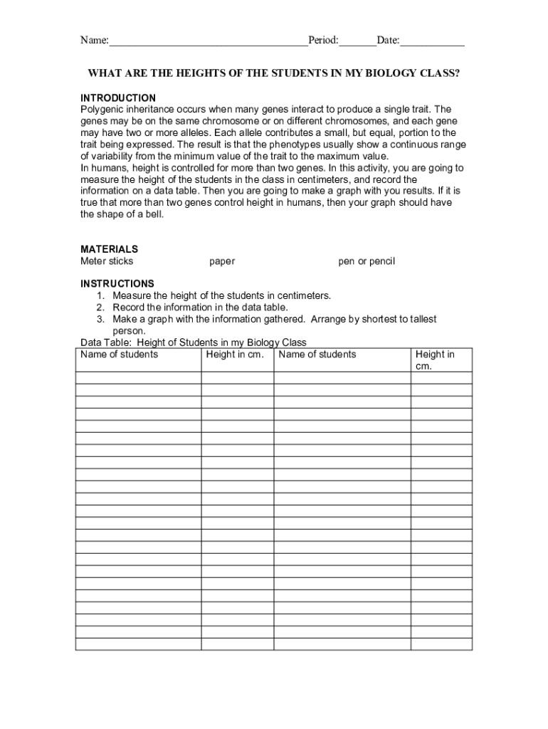 Name:___Period:___Date:___ WHAT ARE THE HEIGHTS OF THE STUDENTS IN MY BIOLOGY CLASS? INTRODUCTION Polygenic inheritance occurs when many genes interact to produce a single trait. The genes may be