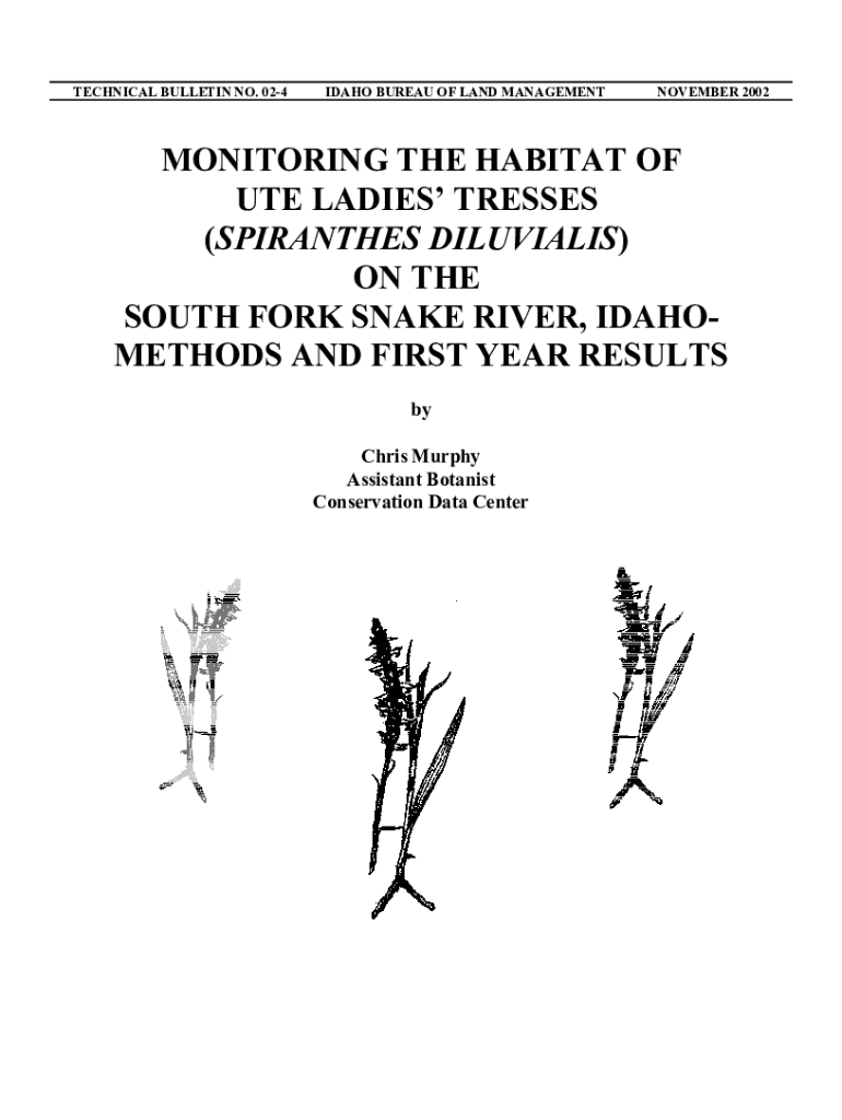 TECHNICAL BULLETIN NO. 024IDAHO BUREAU OF LAND MANAGEMENTNOVEMBER 2002MONITORING THE HABITAT OF UTE LADIES TRESSES (PIRATES DILUVIALIS) ON THE SOUTH FORK SNAKE RIVER, IDAHOMETHODS AND FIRST YEAR RESULTS
