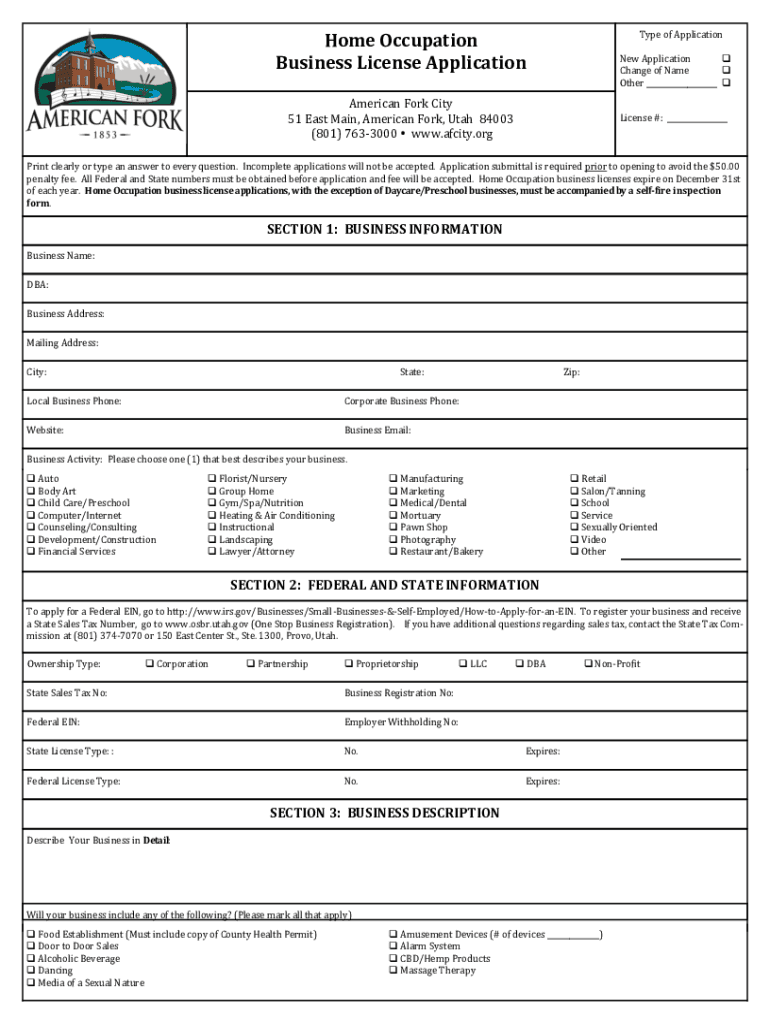 Type of ApplicationHome Occupation Business License Application Change of Name Other ___ American Fork City 51 East Main, American Fork, Utah 84003 (801) 7633000 www.afcity.orgLicense #: ___Print