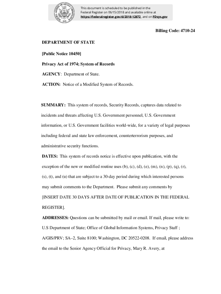 This document is scheduled to be published in the Federal Register on 06/15/2018 and available online at https://federalregister.gov/d/201812872, and on Days. Billing Code: 471024 DEPARTMENT OF STATE