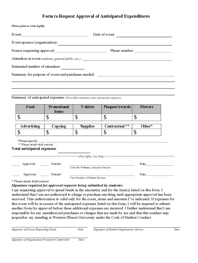 Form to Request Approval of Anticipated Expenditures Please print or write legiblyEvent:Date of event:Event sponsor (organization): Person requesting approval:Phone number:Attendees at event (students,