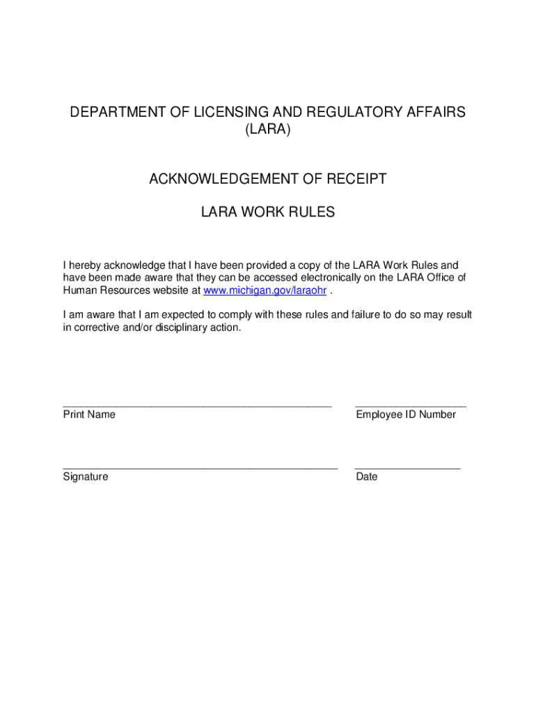 DEPARTMENT OF LICENSING AND REGULATORY AFFAIRS (LARA)ACKNOWLEDGEMENT OF RECEIPT LARA WORK RULES hereby acknowledge that I have been provided a copy of the LARA Work Rules and have been made aware