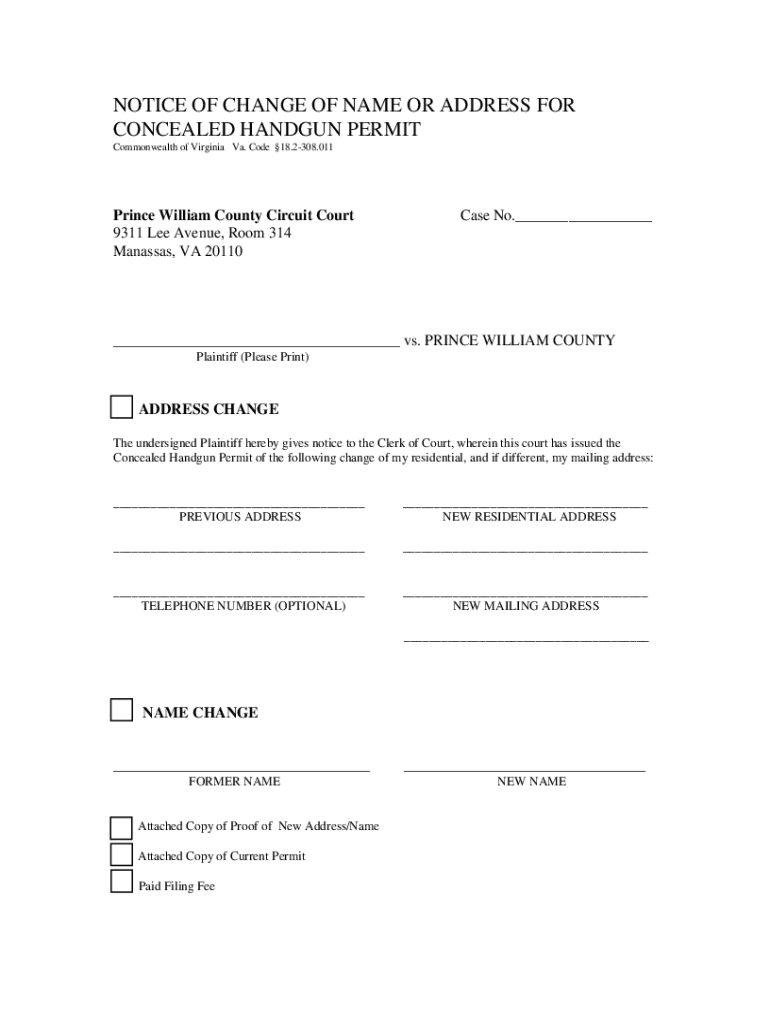 NOTICE OF CHANGE OF NAME OR ADDRESS FOR CONCEALED HANDGUN PERMIT Commonwealth of Virginia Va. Code 18.2308.011Prince William County Circuit Court 9311 Lee Avenue, Room 314 Manassas, VA 20110Case No.______
