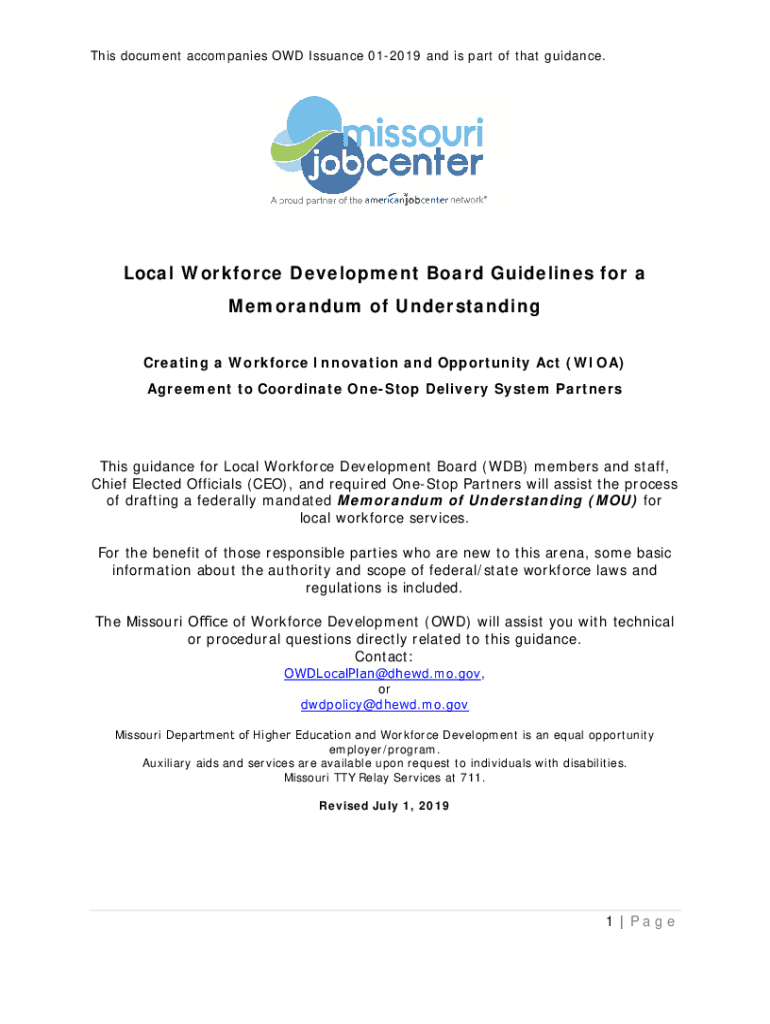 This document accompanies OWN Issuance 012019 and is part of that guidance. Local Workforce Development Board Guidelines for a Memorandum of Understanding Creating a Workforce Innovation and Opportunity