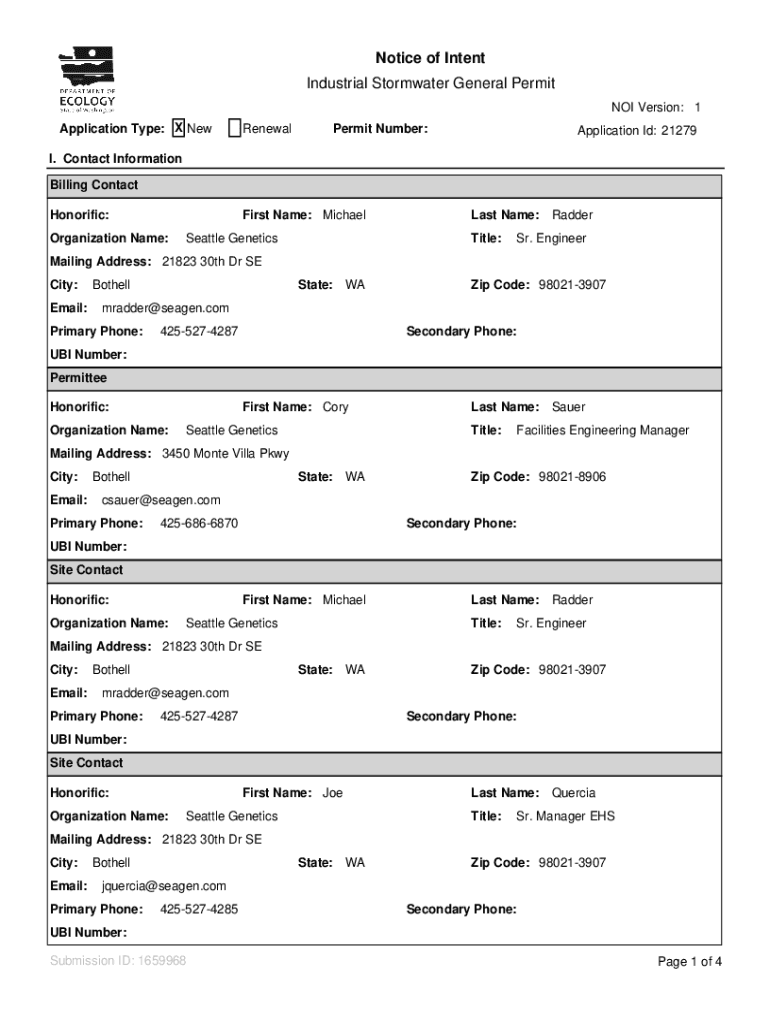 Notice of Intent Industrial Stormwater General Permit NOI Version: 1 Application Type: X NewRenewalPermit Number:Application I'd: 21279I. Contact Information Billing Contact Honorific:First Name: