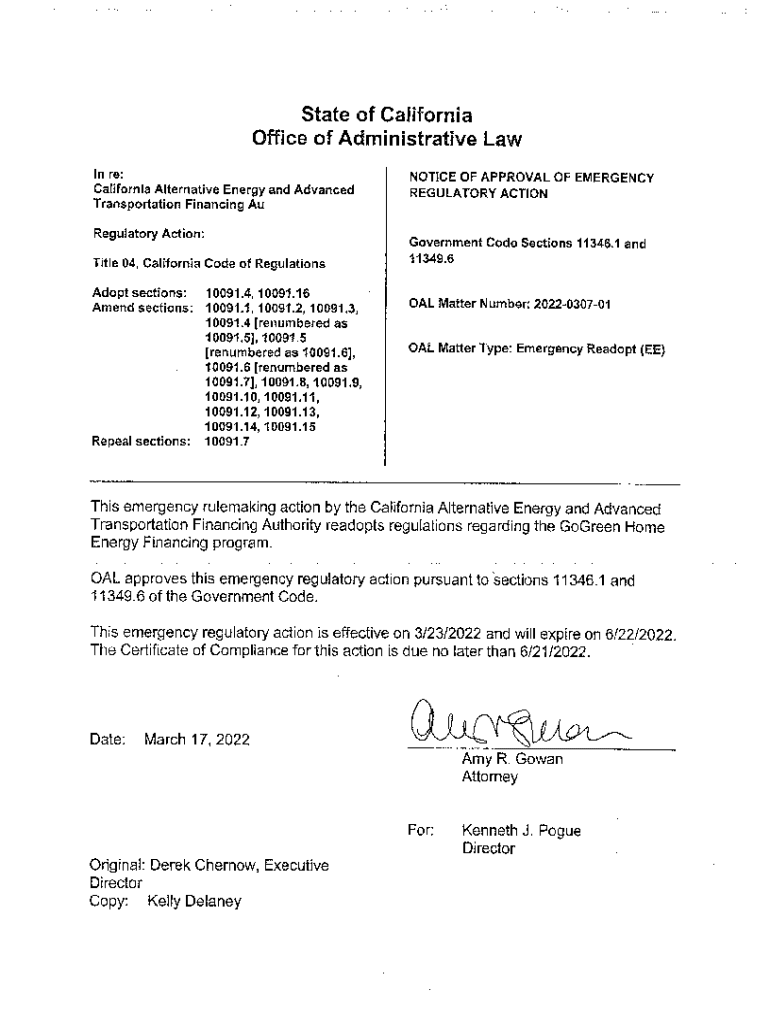 State of California Office of Administrative Law In re: California Alternative Energy and Advanced Transportation Financing Au Regulatory Action: Title 04, California Code of Regulations Adopt sections: