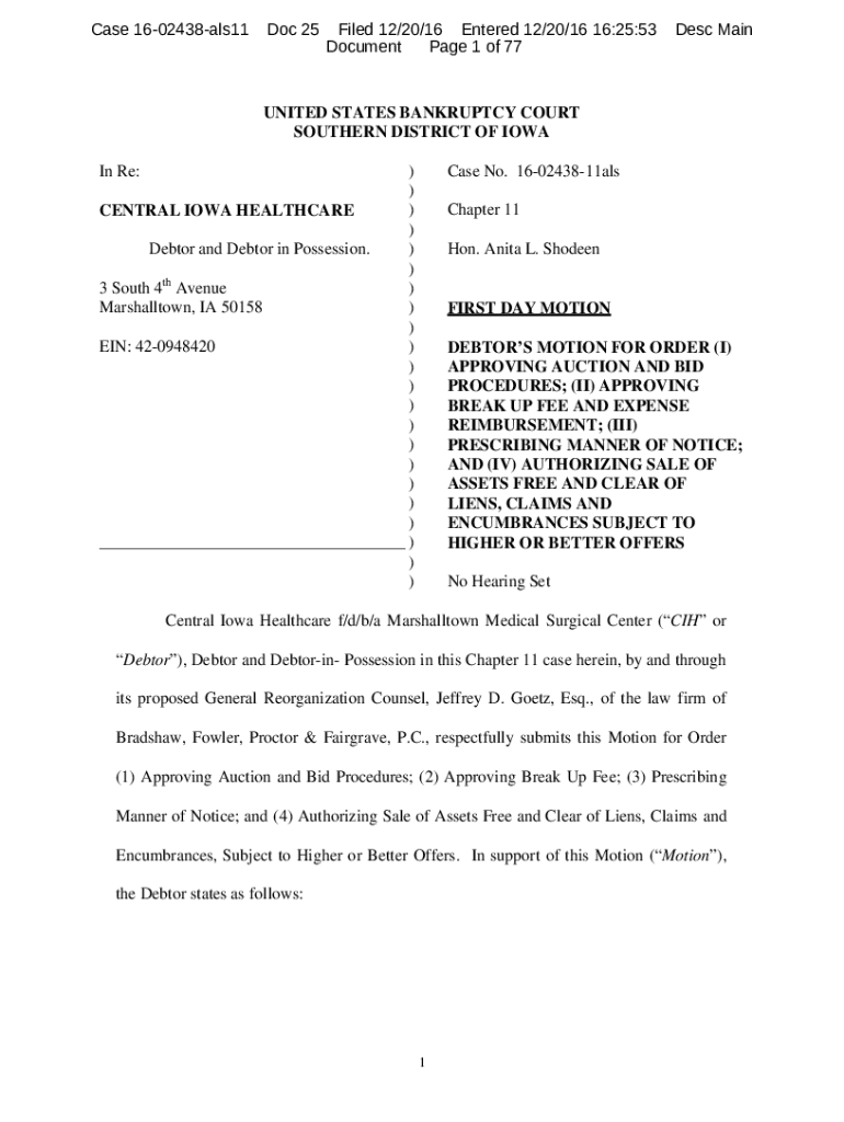 Case 1602438als11Doc 25Filed 12/20/16 Entered 12/20/16 16:25:53 Document Page 1 of 77Desc Maintained STATES BANKRUPTCY COURT SOUTHERN DISTRICT OF IOWA In Re:))) CENTRAL IOWA HEALTHCARE) Debtor and