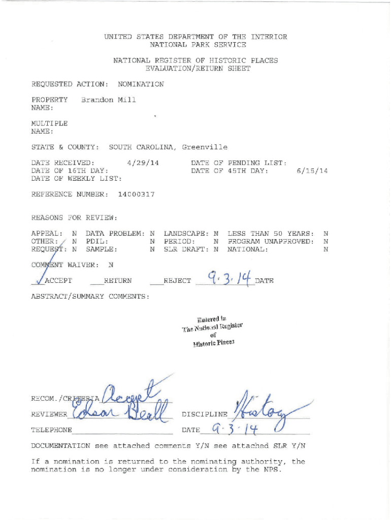 UNITED STATES DEPARTMENT OF THE INTERIOR NATIONAL PARK SERVICE NATIONAL REGISTER OF HISTORIC PLACES EVALUATION/RETURN SHEET REQUESTED ACTION: PROPERTY NAME:NOMINATION Brandon MillMULTIPLE NAME: STATE&COUNTY:SOUTH