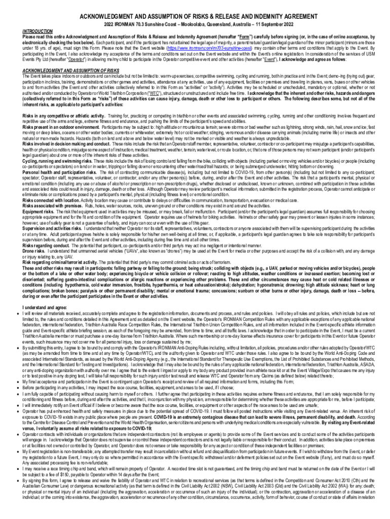 ACKNOWLEDGMENT AND ASSUMPTION OF RISKS & RELEASE AND INDEMNITY AGREEMENT 2022 Iron Man 70.3 Sunshine Coast Mooloolaba, Queensland, Australia 11 September 2022 INTRODUCTION Please read this entire