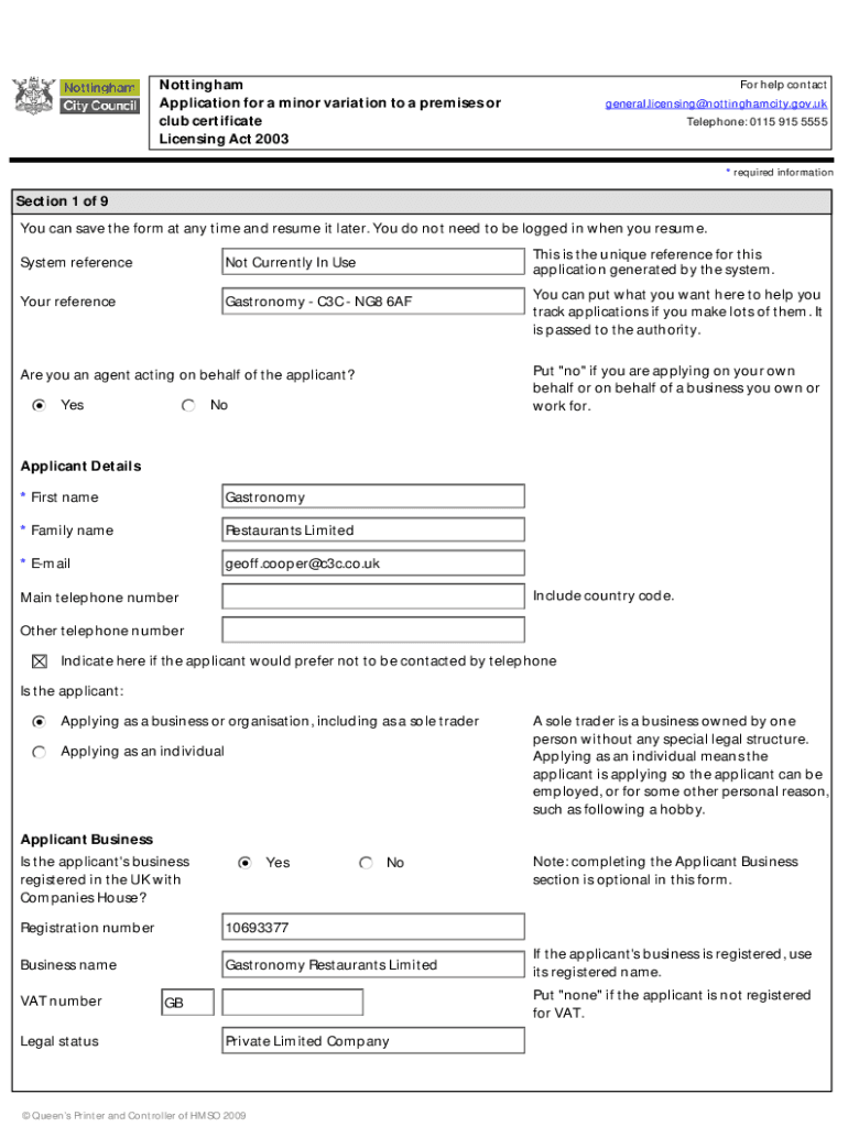 Nottingham Application for a minor variation to a premises or club certificate Licensing Act 2003For help contact general.licensing@nottinghamcity.gov.uk Telephone: 0115 915 5555* required informationSection