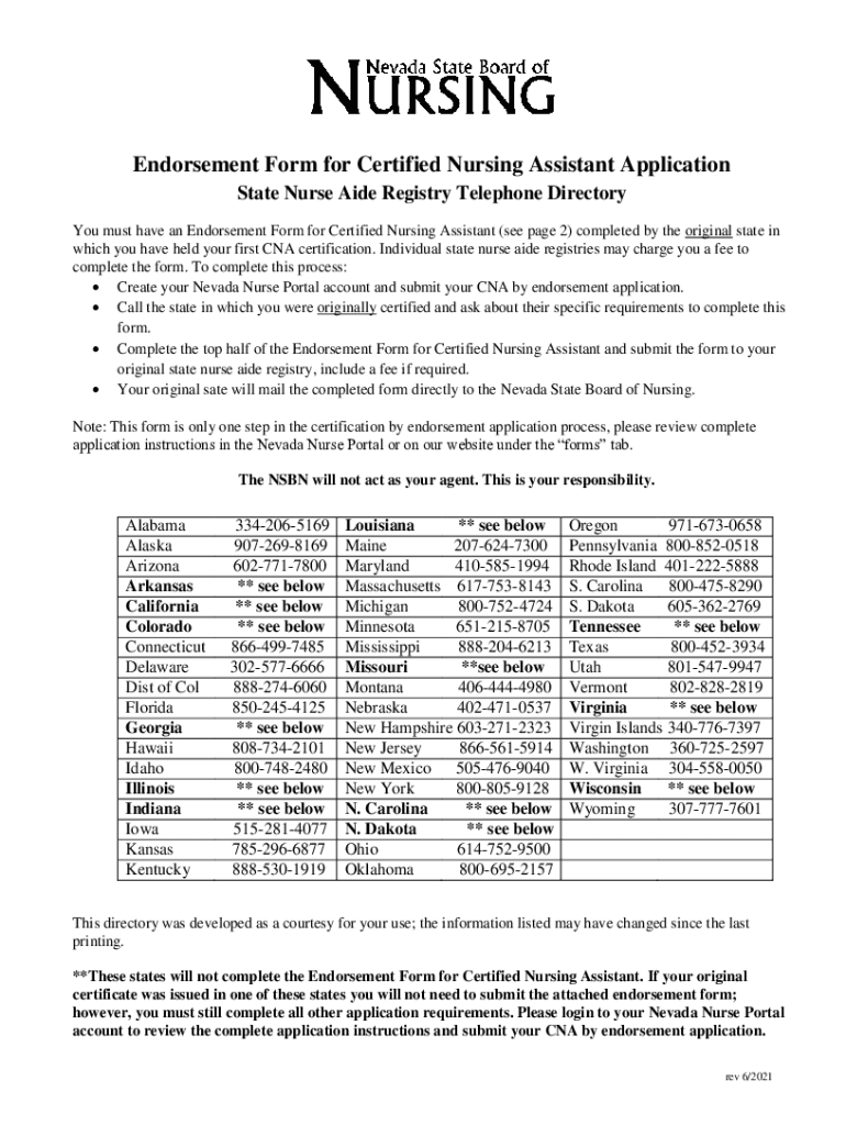 Endorsement Form for Certified Nursing Assistant Application State Nurse Aide Registry Telephone Directory You must have an Endorsement Form for Certified Nursing Assistant (see page 2) completed