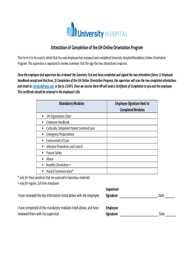 Attestation of Completion of the UH Online Orientation Program This form is to be used to attest that the new employee has reviewed and completed University Hospital Mandatory Online Orientation Program.