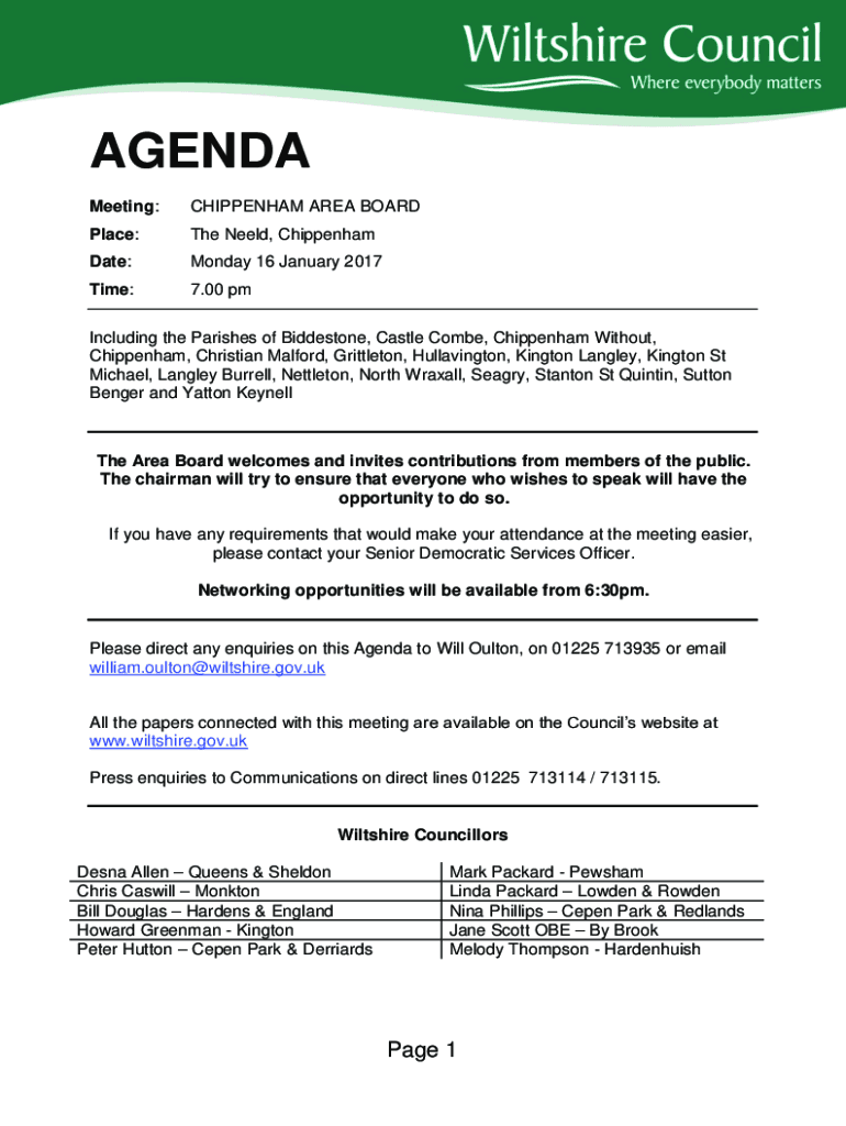 AGENDA Meeting:CHIPPENHAM AREA Workplace:The Need, ChippenhamDate:Monday 16 January 2017Time:7.00 including the Parishes of Bridgestone, Castle Come, Chippenham Without, Chippenham, Christian Milford,