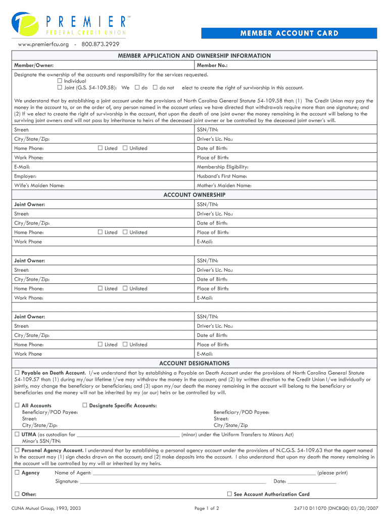 The Premier FCU Member Account Card is a business form used by individuals to apply for membership with Premier Federal Credit Union.