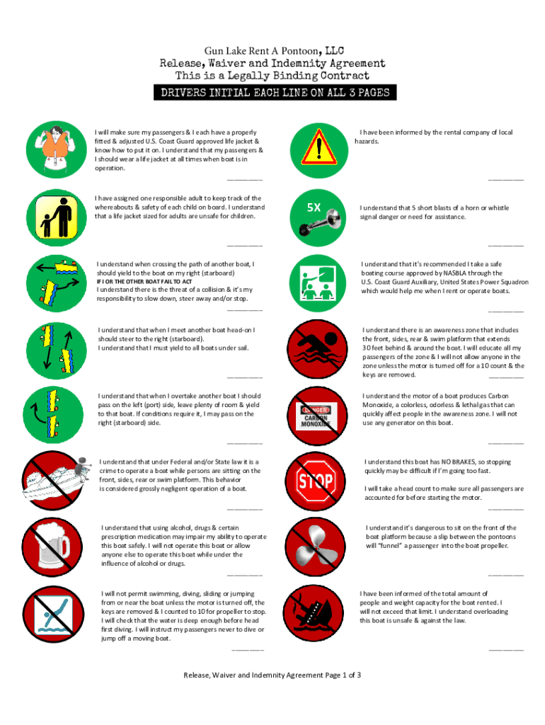 Gun Lake Rent A Pontoon, LLC Release, Waiver and Indemnity Agreement This is a Legally Binding Contract DRIVERS INITIAL EACH LINE ON ALL 3 PAGES will make sure my passengers & I each have a properly