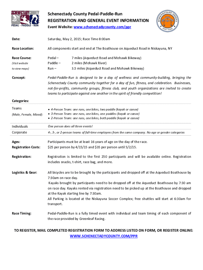 Schenectady County PedalPaddleRun REGISTRATION AND GENERAL EVENT INFORMATION Event Website: www.schenectadycounty.com/ppr Date:Saturday, May 2, 2015; Race Time 8:00amRace Location:All components start