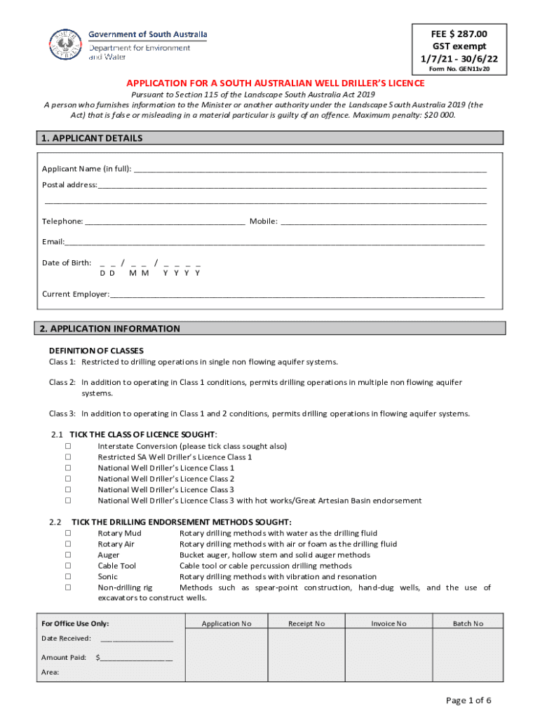 FEE $287.00 GST exempt 1/7/21 30/6/22 Form No. GEN11v20APPLICATION FOR A SOUTH AUSTRALIAN WELL DRILLERS License Pursuant to Section 115 of the Landscape South Australia Act 2019 A person who furnishes
