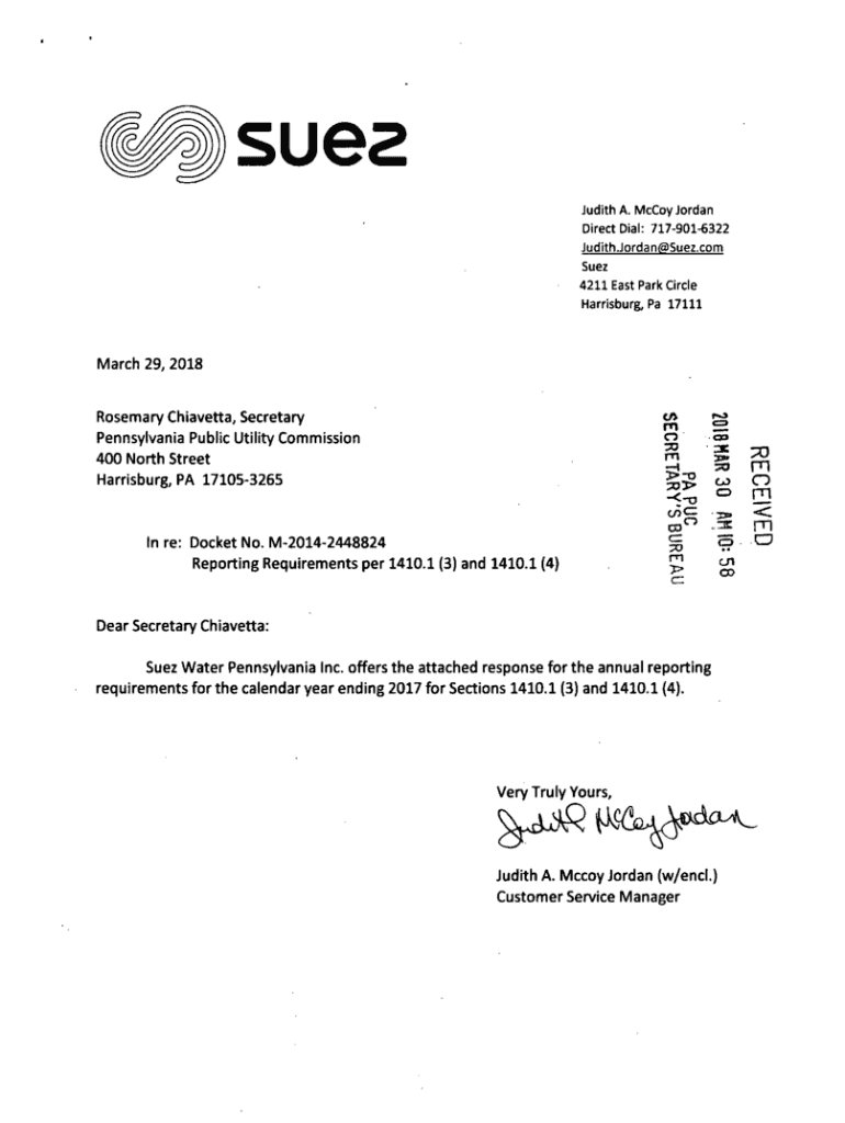 Judith A. McCoy Jordan Direct Dial: 7179016322 Judith.J0rdan@Sue2.com Suez 4211 East Park Circle Harrisburg, Pa 17111March 29, 2018 Rosemary Ciabatta, Secretary Pennsylvania Public Utility Commission