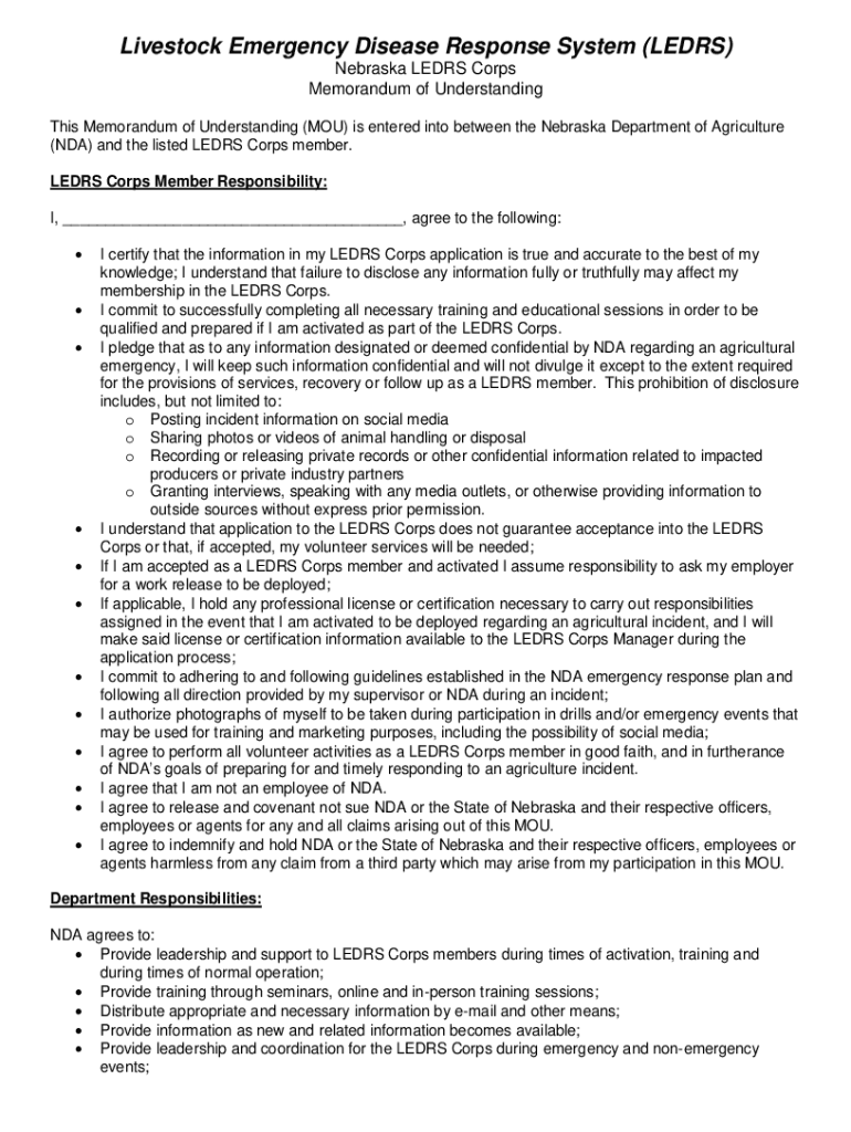 Livestock Emergency Disease Response System (LEERS) Nebraska LEERS Corps Memorandum of Understanding This Memorandum of Understanding (YOU) is entered into between the Nebraska Department of Agriculture