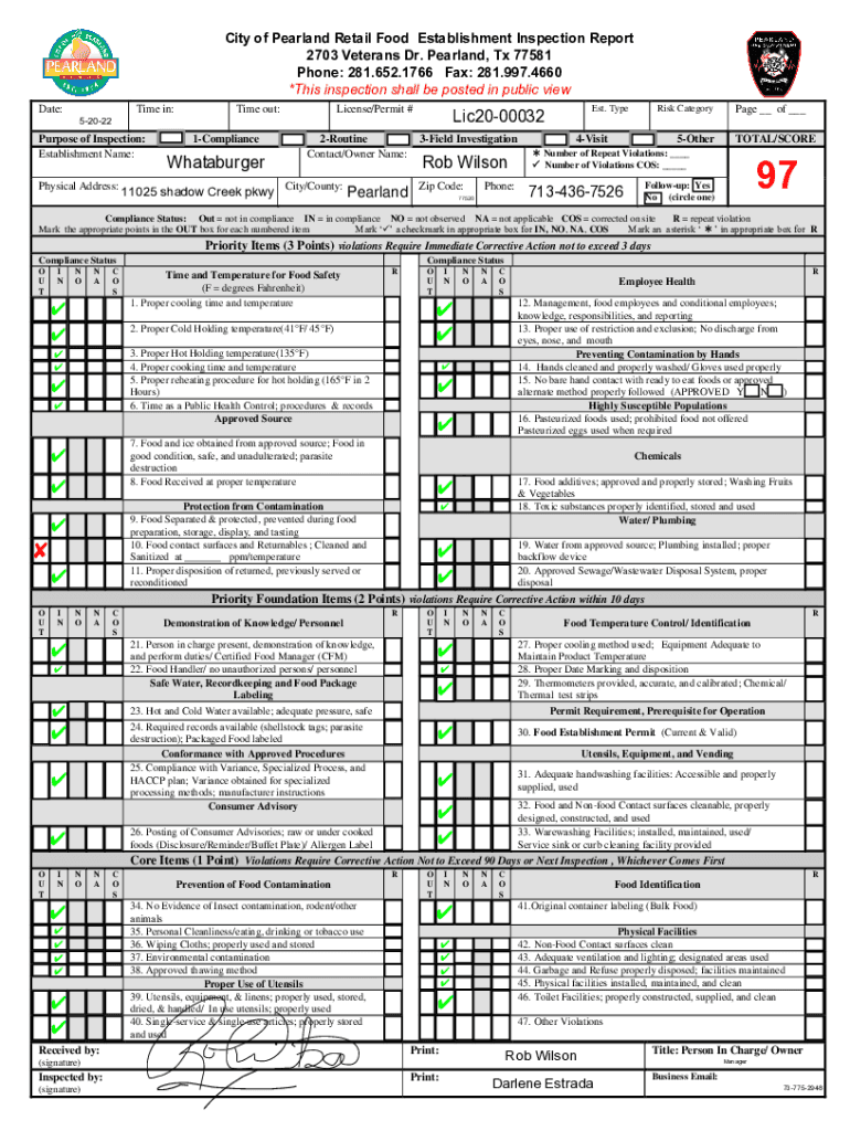 City of Pearland Retail Food Establishment Inspection Report 2703 Veterans Dr. Pearland, TX 77581 Phone: 281.652.1766 Fax: 281.997.4660 *This inspection shall be posted in public view Date:Time in:52022Purpose